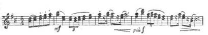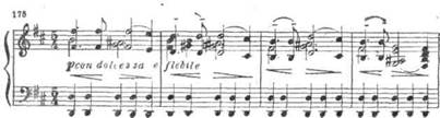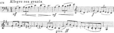 В конце трио возвращается первоначальная мелодическая фраза вальса и начинается повторение всей светлой музыки первого раздела. Но затем вальс снова несколько драматизируется: основная тема, модулируя, появляется у тромбонов в ритмическом увеличении, в нарочито-ровном, акцентируемом движении четвертями и в сопровождении тремоло литавр. В коде же на фоне тоники (контрабасы и литавры) проходит нисходящая гаммаобразная тема, появившаяся впервые еще в разработке первой части, а своими интонационными истоками связанная с нисходящей мелодией вступления (см. пример 162). Эта тема нарушает светлый характер музыки. Возвращающиеся вновь элегические интонации трио особенно явно обнаруживают на этот раз связь "с трагическими секундовыми интонациями первой части.