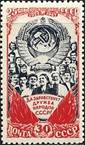 1271. 30 к. – Трудящиеся союзных советских социалистических республик на фоне Государственного герба СССР. Алые знамена и текст: «Да здравствует дружба народов СССР!» – сине–черная, красная ……–50 –15