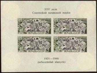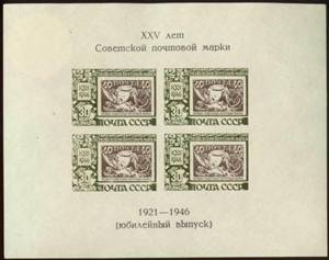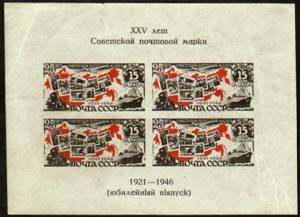 Фототипия в сочетании с п. типографской. Без зубцов. Размер 13.5 х 10 см. На полях текст: «XXV лет советской почтовой марки» и «1921–1946 (юбилейный выпуск)».