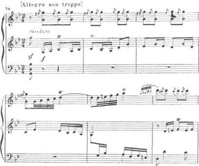Небольшой развивающийся раздел, построенный на секвентном развертывании одного из видоизмененных оборотов лейтмотива («Не узнаю теперь я сам себя»), приводит к сжатому репризному проведению темы. Возникающее здесь напряжение постепенно рассеивается в задумчивых полуречитативных фразах («Не тот я стал теперь, не тот я стал»), построенных на лейтмотиве. Им завершается эта часть.