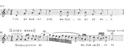 В конце сцены пирушки появляется возлюбленная Грязного Любаша (меццо-сопрано). По просьбе Малюты она поет песню о горькой участи девушки, выданной замуж за немилого («Снаряжай скорее, матушка родимая»). Печальная песня Любаши служит первой характеристикой этого действующего лица и образует выразительный контраст с предшествующими сценами. Песня эта — один из самых лучших примеров замечательного проникновения Римского-Корсакова в дух и музыкальные особенности народного песенного творчества. Она написана в стиле протяжных народных песен и состоит из двух куплетов (второй — вариация первого). Песня, исполняемая без сопровождения, изложена в натуральном минорном ладе, ее мелодические обороты — типично народного склада. Среди них — начальный широкий ход через кварту и квинту к верхней октаве и плавные нисходящие интонации, напоминающие плач-причитание (они особенно подчеркнуты во втором куплете — см. пример 76 б).