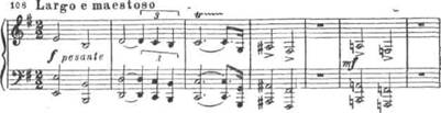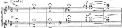 Проведение обеих тем прослаивается тихими и долго тянущимися как бы застылыми аккордами деревянных духовых. Они интонационно и гармонически родственны теме султана: в нижнем голосе использованы звуки, встречающиеся на сильных долях темы (ми—ре—до…); среди трезвучий диатонических ступеней ми минора появляется двойная доминанта (4-й такт примера). Эти аккорды составляют разительный контраст с предшествующей темой Шахриара и при всей своей простоте производят необычное, фантастическое впечатление
