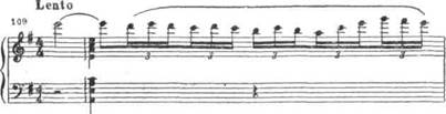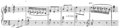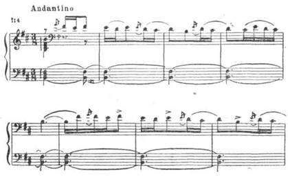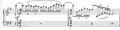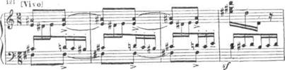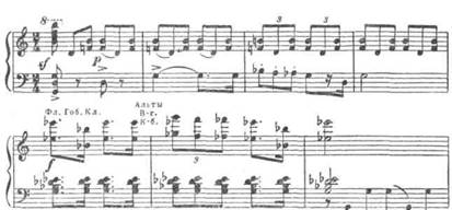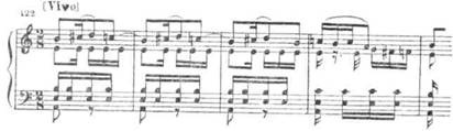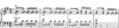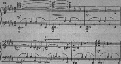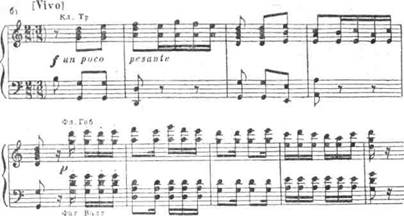 В дальнейшем развитии темы ярче выявляется ее ритмическая острота, а в выразительных подголосках и нонаккордах, которыми гармонизуется тема, выступают иные — более страстные и эмоционально напряженные черты этого музыкального образа.