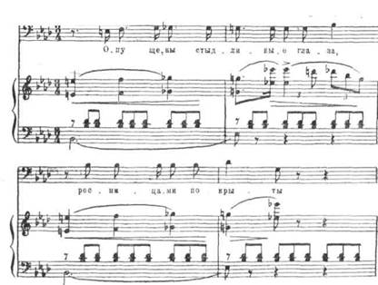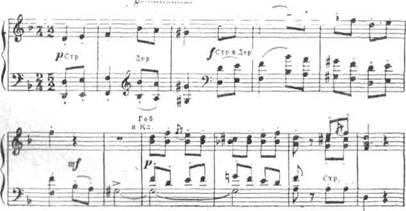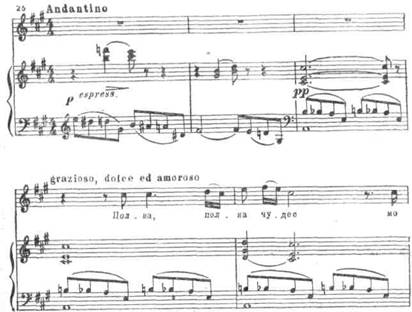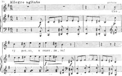 Подвижная, льющаяся на одном дыхании ариетта выдержана в одном характере и выражает полноту радостных чувств Купавы. Непрерывная пульсация струнных з1асса1о подчеркивает счастливо возбужденное настроение девушки и вносит новый тембровый колорит в партитуру этого акта.