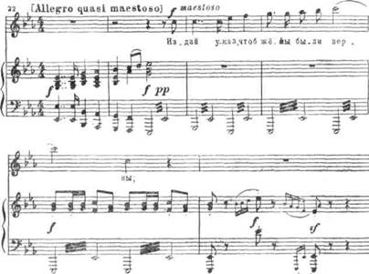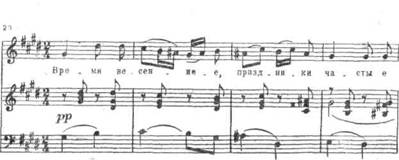 Следует добавить, что этот гимн звучит здесь вторично: первый раз берендеи встречали им царя при его выходе. Такая реприза гимна, образующая музыкальное обрамление сцены суда, подчеркивает ее значение и придает завершенность музыкальной композиции. В этом примере проявляется одна из типичных закономерностей музыкальной формы в операх Римского-Корсакова. Композитор постоянно стремится придавать музыкальной форме оперных сцен архитектоническую стройность, ясность и завершенность. Подобные особенности оперной формы характерны вообще для произведений эпической драматургии.
