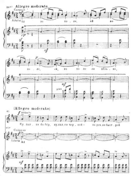 Хороводная песня обработана композитором в народной подголосочной манере с сохранением ладовых особенностей напева (сопоставление параллельных мажора и минора, использование VII низкой ступени в мажоре). В куплетно-вариационное развитие песни «вставлены» несколько проведений плясовой, благодаря чему форма получает завершенность.