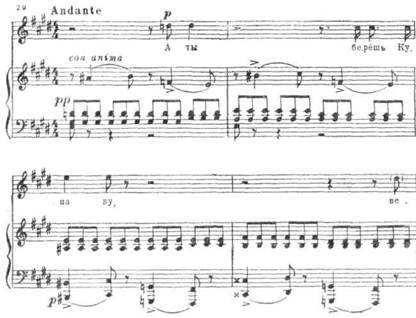Во вступительном соло флейты один из основных мотивов Снегурочки впервые проходит в миноре и приобретает благодаря этому печальный характер. Элегически звучащие первые фразы («Пригожий Лель, ужель тебе не жалко») интонационно связаны с некоторыми мелодическими оборотами ариетты ре минор (см. фразу «и громкие раскаты соловьев»):