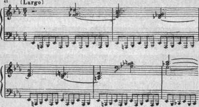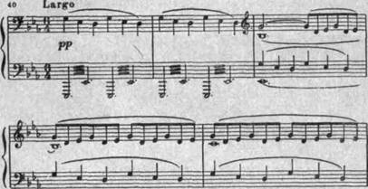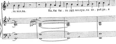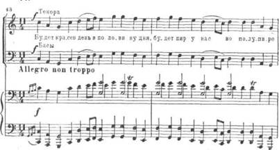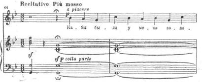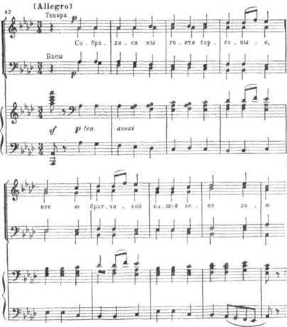 Свободном размере) и как бы топчущаяся на месте тема проходит в октавном унисоне мужского хора и оркестра. Она создает представление о могучей, но тупой силе: