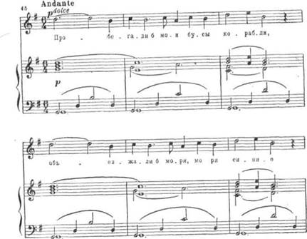 Речитатив переходит в арию. Она написана в простой трехчастной (и одновременно куплетно-вариационной) форме. В арии ярко выражено песенное начало и вместе с тем в ее песенно-былинной мелодии содержатся и речитативные обороты. Плавно покачивающееся сопровождение вызывает образ морских далей: