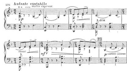Сцена Авроры и Дезире – третий лирический центр в балете. В основе её музыки – широконапевная, пластичная тема Фа мажор.