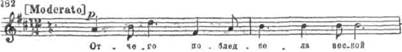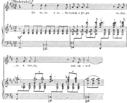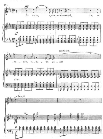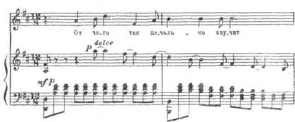 Это основное зерно постепенно мелодически развивается. В форме романса сочетаются принципы варьированной строфы и сквозного развития. Так, при втором проведении темы («Отчего так печально звучит») в вокальной мелодии изменяется, по сравнению с первой строфой, лишь последняя фраза (ср. «Погребальным покровом роса?» с концом первой строфы «Голубая фиалка нема?»), но в фортепианной партии с самого же начала второй строфы появляется мелодический подголосок — нисходящая мелодия (см. пример 283).
