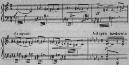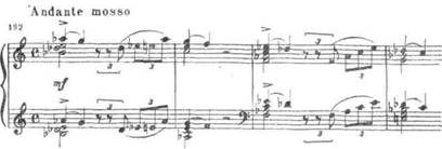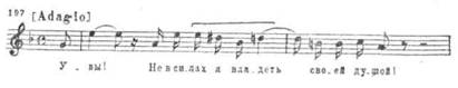 Эта лирическая, трепетная тема (впервые появляющаяся у гобоя) сочетается затем с разговорно-напевной мелодией голоса («Я к вам пишу…»). Второй раздел монолога представляет собой трехчастное построение. Его средний эпизод (А6а§ю) предваряется речитативом — «О да, клялась я сохранить в душе…» Он включает в себя отдельные интонации различных вариантов первой темы-секвенции. В оркестре звучит мелодия, родственная вступлению ко второй картине (ср. с примером 192):
