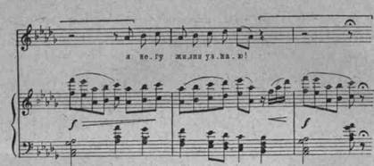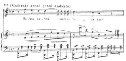 Сплетение тем, переходящих из голоса в оркестр, а также создающаяся благодаря этому непрерывность мелодического нарастания чрезвычайно типичны для Чайковского. В момент кульминационного проведения ре-бемоль-мажорная тема звучит гог1е одновременно у оркестра и голоса, а затем еще более напряженно «допевается» в оркестровом заключении.