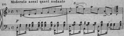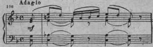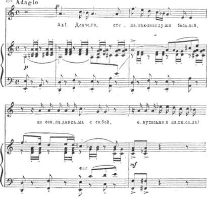 Взволнованный характер музыки усиливается паузами, синкопированным ритмом сопровождения. Единство, целеустремленность придают развитию этой темы и характерные для Чайковского мелодические «ответы» оркестра на прозвучавшие в голосе мотивы (см. напр. такты 4 — 8 в примере 194).