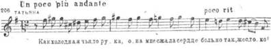 После небольшого диалога секунданта Зарецкого с Ленским следует ария-монолог. Она начинается по-речевому выразительной, но вместе с тем напевной фразой: «Куда, куда, куда вы удалились? ..» на фоне простого аккордового сопровождения (см. пример 208 а). Затем появляется основная, уже знакомая по вступлению, тема. Синкопированный ритм, восходящие мелодические подголоски в оркестре вносят в музыку черты взволнованности, трепетности. Как и в сцене письма Татьяны, Найковским используется здесь прием «диалога» между голосом и оркестром (см. пример 208 б): К этому же приему прибегает Чайковский и в начале среднего раздела арии (см. пример 209 — повторение в оркестре мелодии голоса — «Блеснет заутра луч денницы»), создавая ощущение непрерывного мелодического движения.