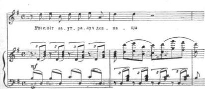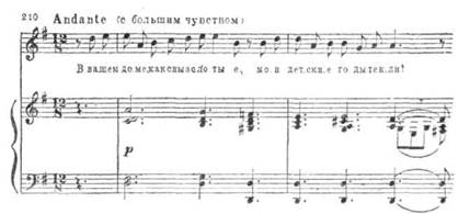 Средний раздел более подвижен, светел (тональность Соль мажор). Он интонационно связан с соль-мажорным ариозо Ленского «В вашем доме», являясь его вариацией (см. пример 210).