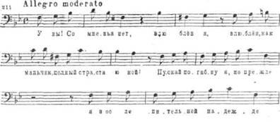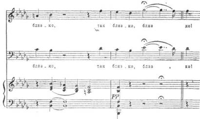 И интонационный склад этой мелодии (спускающейся по ступеням от мелодической вершины — соль), и тональность ее (ми минор) вызывают ассоциацию с образом Ленского и его предсмертной арией («Что день грядущий мне готовит…»). Снова подчеркивается близость судеб этих двух героев оперы.