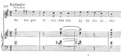 Как вариант мелодии из арии Гремина звучит фраза Татьяны — «Зачем у вас я на примете? ..» Она развивается в диалоге между голосом и оркестром и секвентно поднимается к мелодической вершине — солъ-диез.