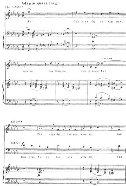 После обращения Онегина («Ужель, ужель в мольбе моей смиренной…») следует новый значительнейший по интонационной выразительности, но предельно краткий, эпизод — дуэт-элегия (си-бемоль минор) Татьяны и Онегина—«Счастье было так