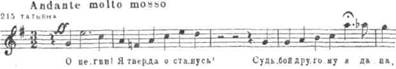 Весь последний раздел сцены посвящен раскрытию волевого начала в характере Татьяны, показу значения для нее чувства долга. Решительно звучат ее ответные фразы Онегину с подчеркнутым интервалом большой септимы фа—ми и диапазоном ноны:
