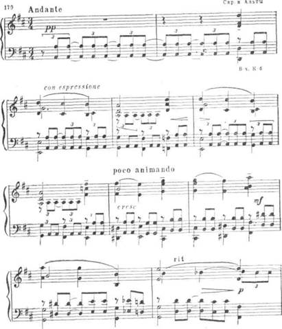 Непрерывно развиваясь в восходящей секвенции, мелодия достигает большой страстности и напряженности. В момент кульминации (пример 181) она особенно наглядно выявляет свои интонационные связи с темой побочной партии первой части (пример 180):