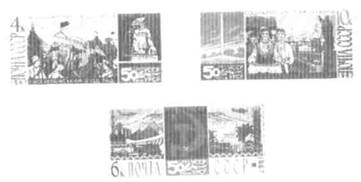 На многоцветных марках – юбилейная дата «50 лет УССР», лавровая ветвь. Теист на русском и украинском языках.