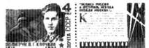 3509. 4 к. – Портрет В. Г. Клочкова. Боевой подвиг панфиловцев. На купоне текст: «Велика Россия, а отступать некуда – позади Москва!» и краткая биография героя. Справа – рисунок: московское небо осенью 1941 г. – темно–серая, красная ……–04 –02