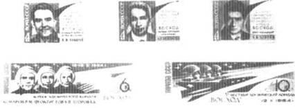 3114. 10 к. – Космический корабль в полете. Космонавты в гермошлемах. Текст: «Трехместный космический корабль «Восход»[,] 12.Х.1964 г.» – синяя, сине–фиолетовая ………. –30 –10