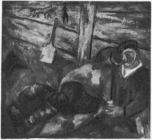 Он резко порывает с прежним кругом тем и расширяет сферу своего художественного видения использованием пластов «примитивного» искусства. Художник начинает писать сцены провинциальной жизни («Парикмахер», «Трактир», «Прогулка в провинциальном городе»), передавая их особый колорит. Интерпретируя художественный язык народного лубка и вывески, иконы и расписной прялки, Ларионов создает яркие, декоративные полотна с экспрессивно нарисованными мотивами повседневного быта. Его служба в армии дает ему богатый материал для солдатской серии картин («Отдыхающий солдат»*, «Утро в казарме», «Купающиеся солдаты»), в которых Ларионов изображает эпизоды однообразной солдатской жизни.