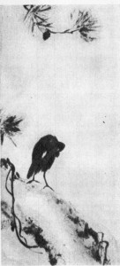 На листе старой, чуть пожелтевшей бумаги черной тушью нарисован изогнутый ствол сосны и на нем — съежившаяся, нахохлившаяся, спрятавшая голову под крыло птица. В верхней части картины изображена ветка с шишкой и длинными иглами хвои. Вот и все. Не сразу ясно, что это такое: набросок? мимолетная зарисовка? Но как точно рассчитана композиция, как тонко передают оттенки черной краски различную фактуру — кору дерева, оперение птицы, влажный туман атмосферы!